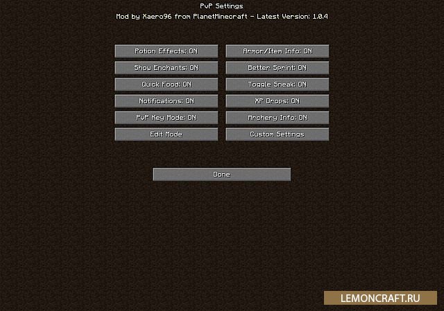 Мод на PVP Better PvP предназначен для любителей игры майнкрафт в стиле РПГ, на экран будет выводится информация о статусе брони и предметов, наложенных эффектах, информация о получаемом опыте и куча другой полезной информации. Если в настройках мода включить всю доступную к выводу информацию, она займет практически весь экран монитора. Выберите именно то, что вам нужно, остальное можно просто отключить.